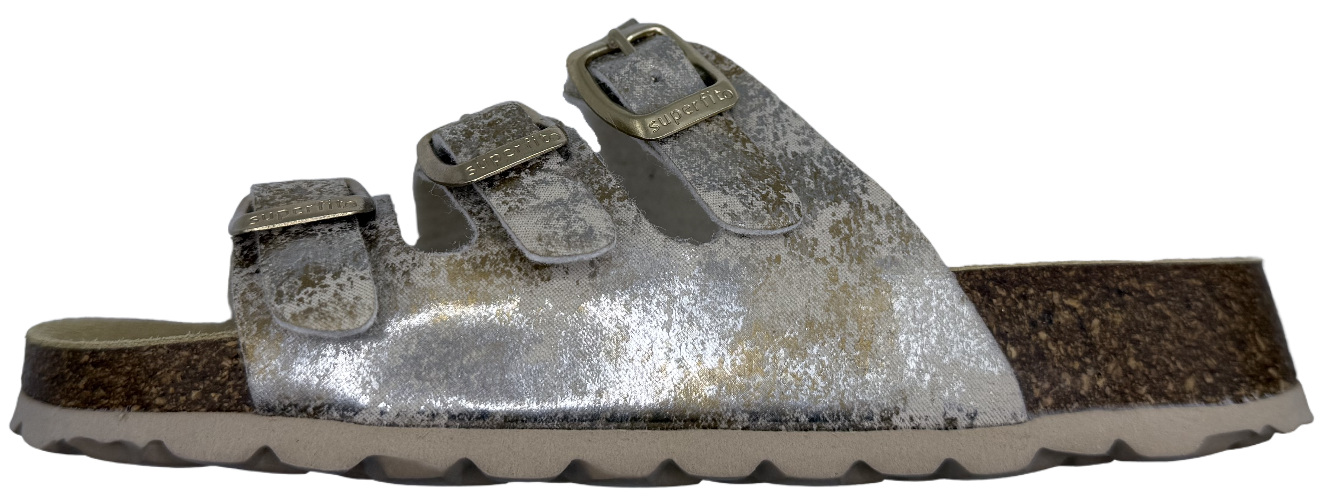 Parádní pantofle s koženou, anatomicky tvarovanou stélkou, která podporuje příčnou i podélnou klenbu chodidla. Dobře drží na noze díky třem páskům, které lze nastavit na šířku nohy. Korková podešev, pásky v kombinaci syntetika/textil.