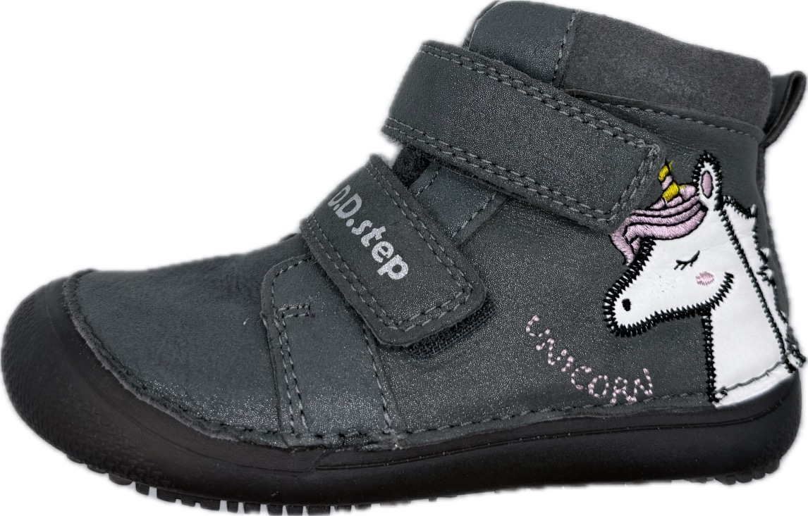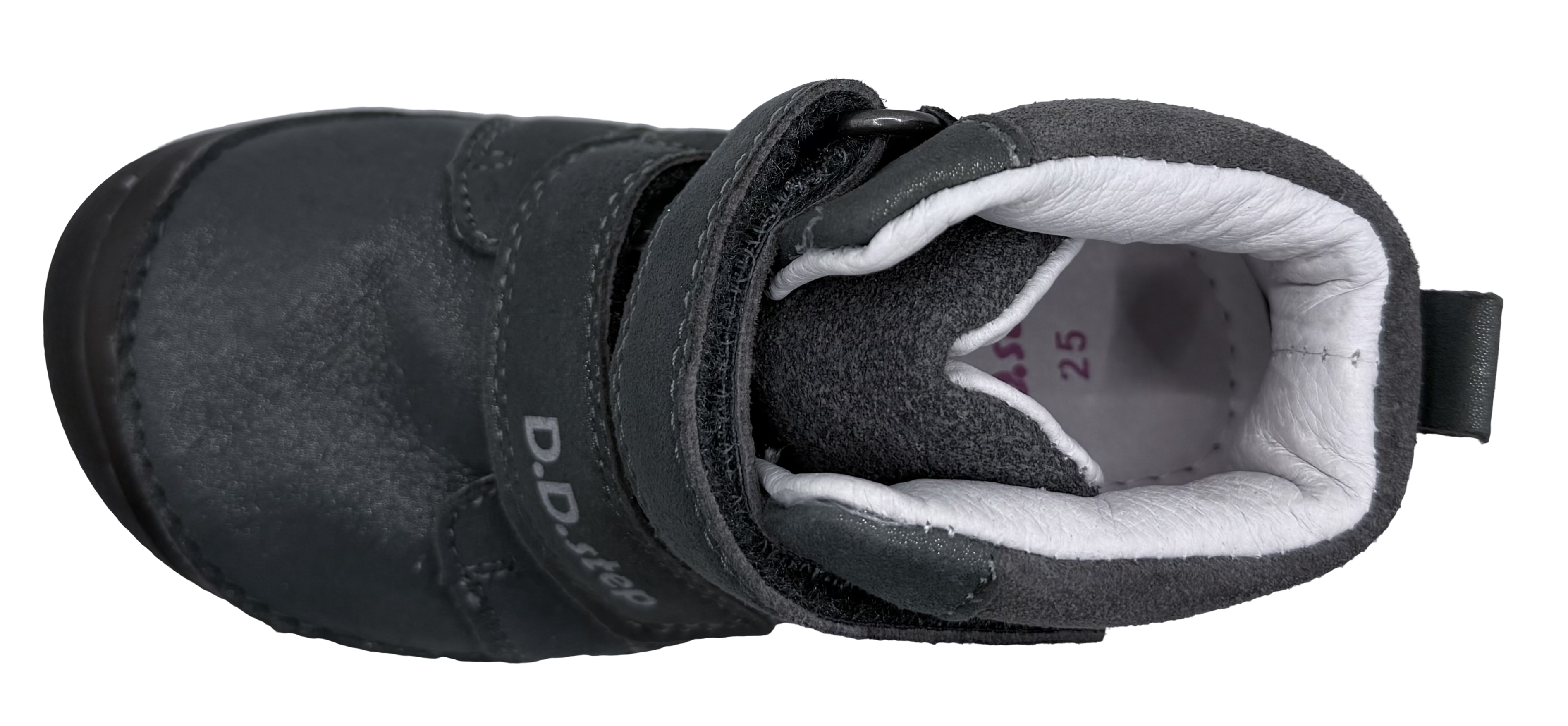 Celoroční kožená obuv značky DDStep na dva suché zipy. Maximálně flexibilní podešev. Uvnitř boty se nachází kožená, netvarovaná, vyjímatelná stélka. Nezpevněný opatek.