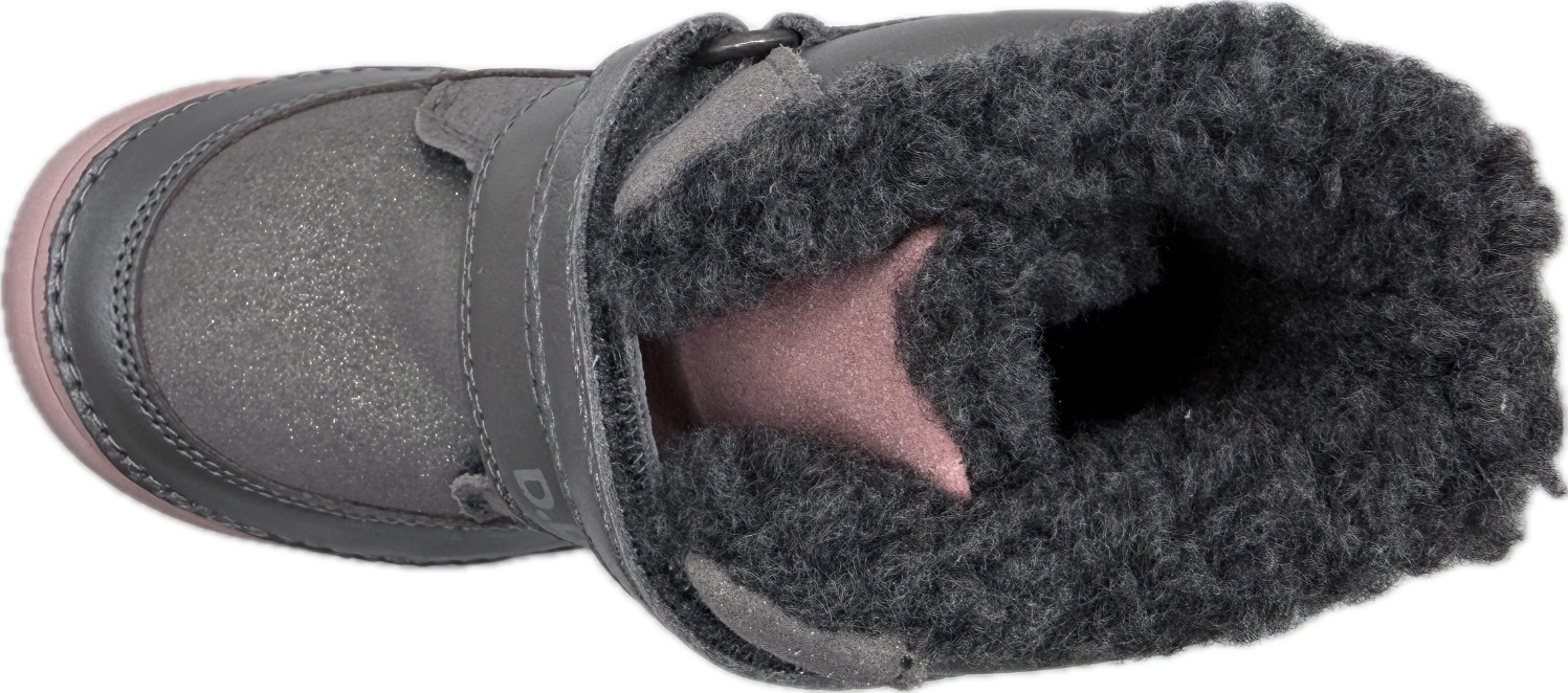 Zimní kotníková kožená obuv se zapínáním na dva suché zipy. Vnitřek je zateplený kožíškem, který dle výrobce obsahuje 60% ovčí vlny. Uvnitř boty se nachází vyjímatelná, zateplená stélka. Flexibilní podešev s prostornou špičkou, která zajišťuje dostatečný prostor pro prsty. Zpevněný opatek.