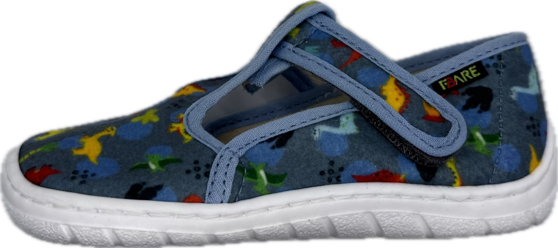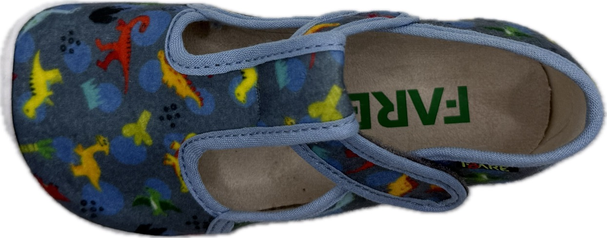 Dětská domácí/přezůvková štróblovaná obuv na suchý zip. Našívací (štróblovaná) stélka umožňuje lepší ohyb boty. Vrchový materiál: textil. Podešev je vyrobena z termokaučuku, který je velmi flexibilní příčně, ale i podélně.
