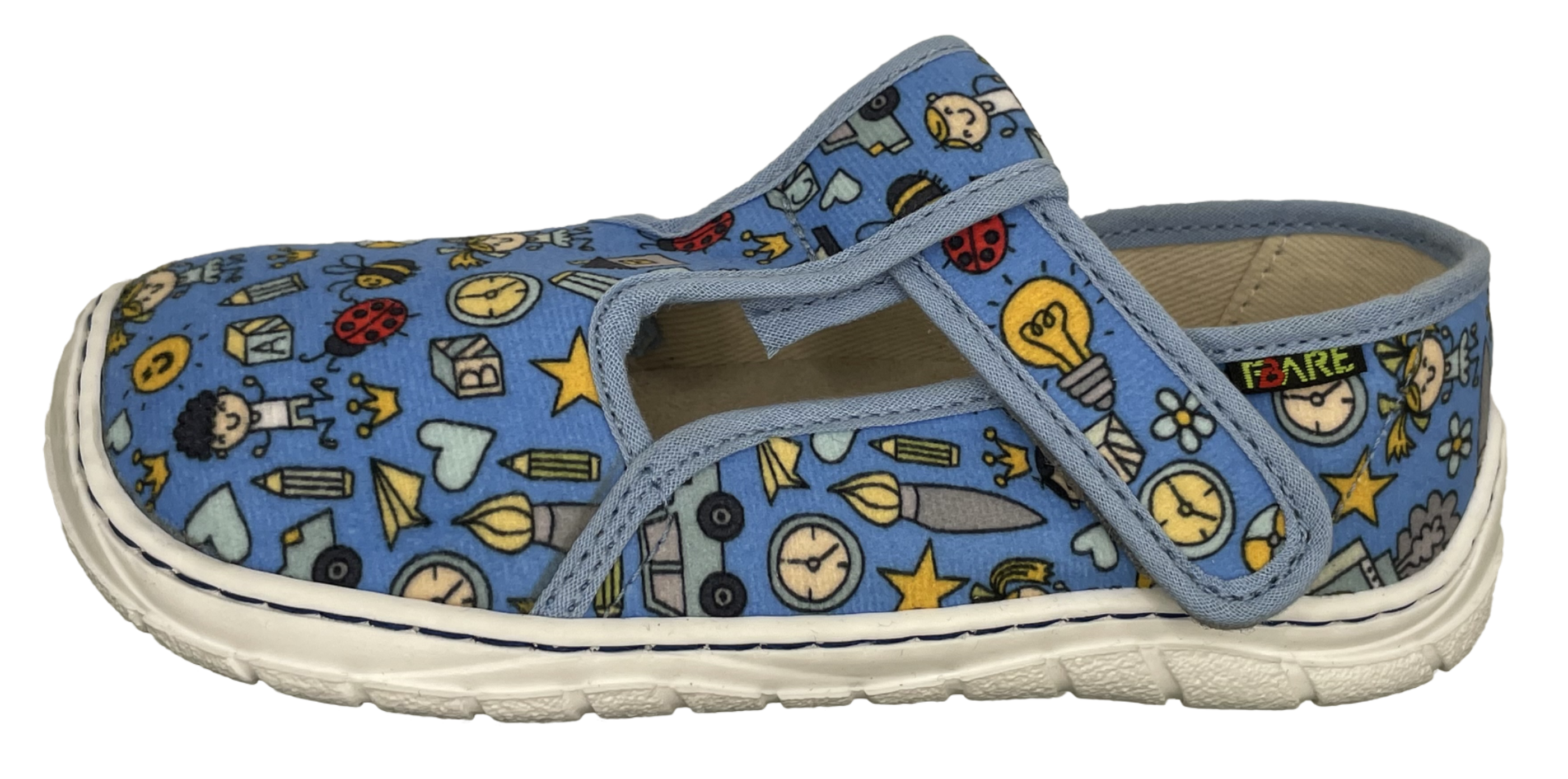 Dětská domácí/přezůvková štróblovaná obuv na suchý zip. Našívací (štróblovaná) stélka umožňuje lepší ohyb boty. Vrchový materiál: textil. Podešev je vyrobena z termokaučuku, který je velmi flexibilní příčně, ale i podélně.