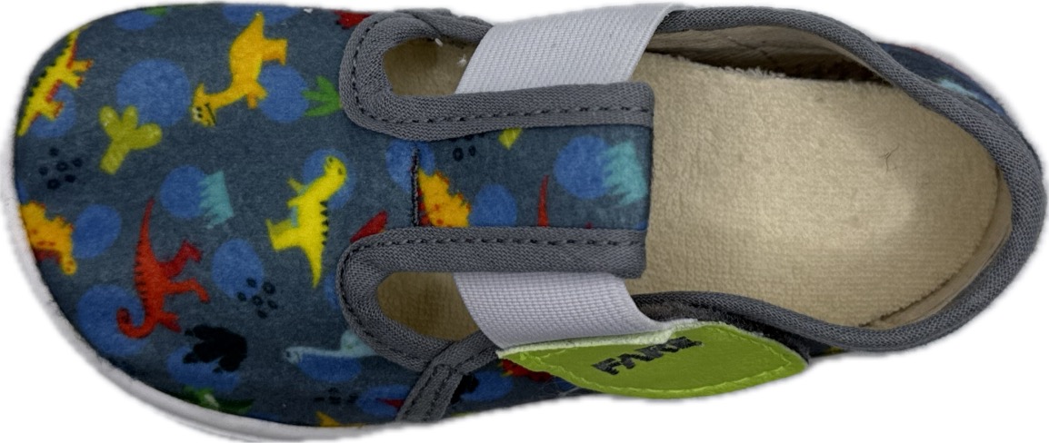 Dětská domácí/přezůvková štróblovaná obuv se zapínáním na suchý zip v kombinaci s gumičkou. Našívací (štróblovaná) stélka umožňuje lepší ohyb boty. Vrchový materiál: textil.