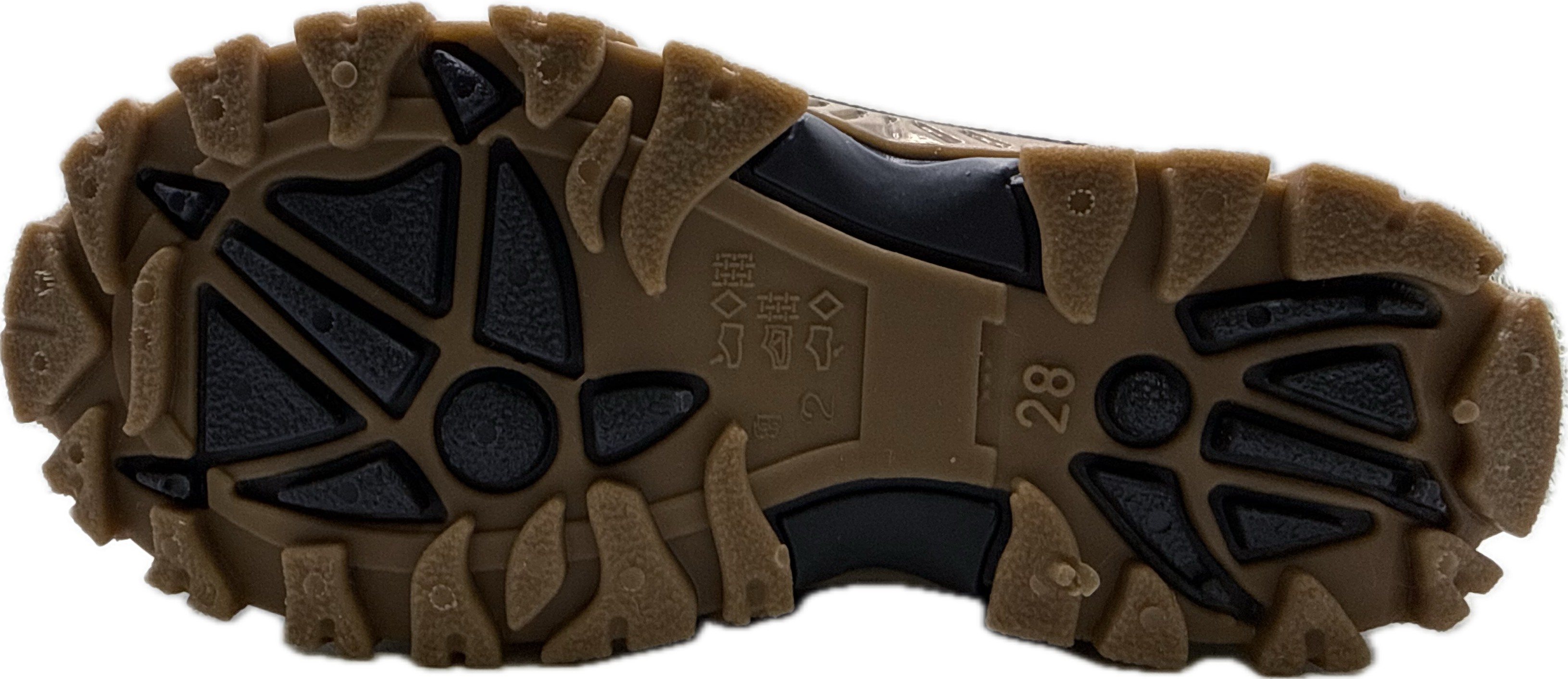 Zapínání – pásky na suchý zip, gumová tkanička. Svršek ze syntetiky v kombinaci s textilem, vnitřní část zateplena, tento model má pevný opatek, pružná a ohebná protiskluzová podešev.