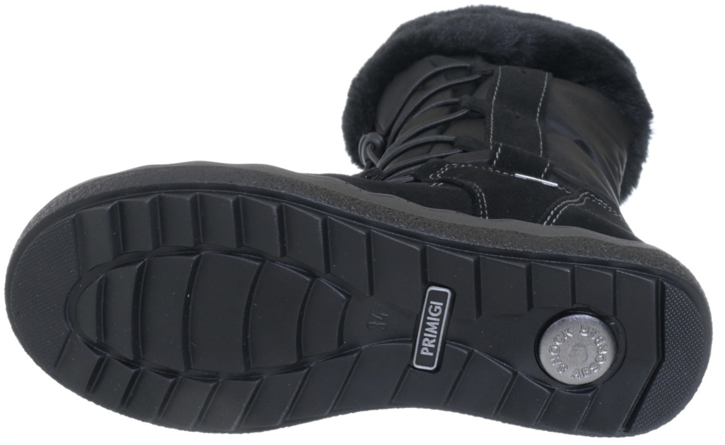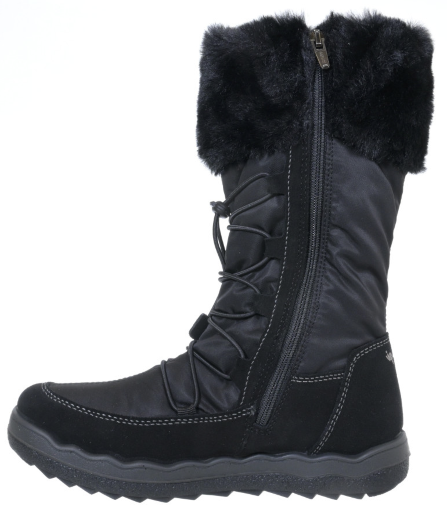 Svršek tvořen kombinací kůže/textil, uvnitř teplý textilní kožíšek. Ohebná neklouzavá podešev s výrazným vzorkem pro bezpečnou chůzi po klouzavém povrchu. Stahování pomocí šňůrky, na boku zip.