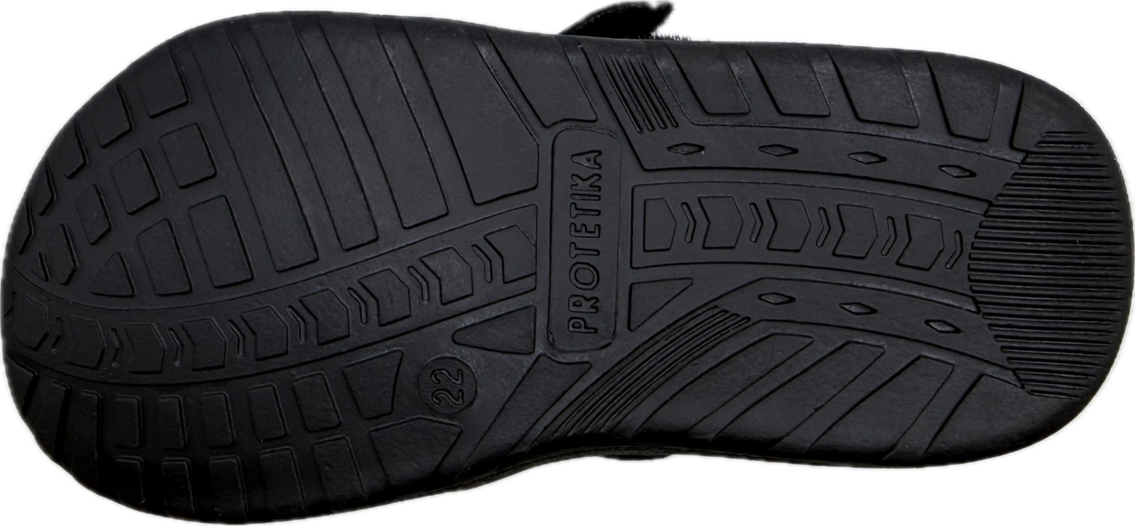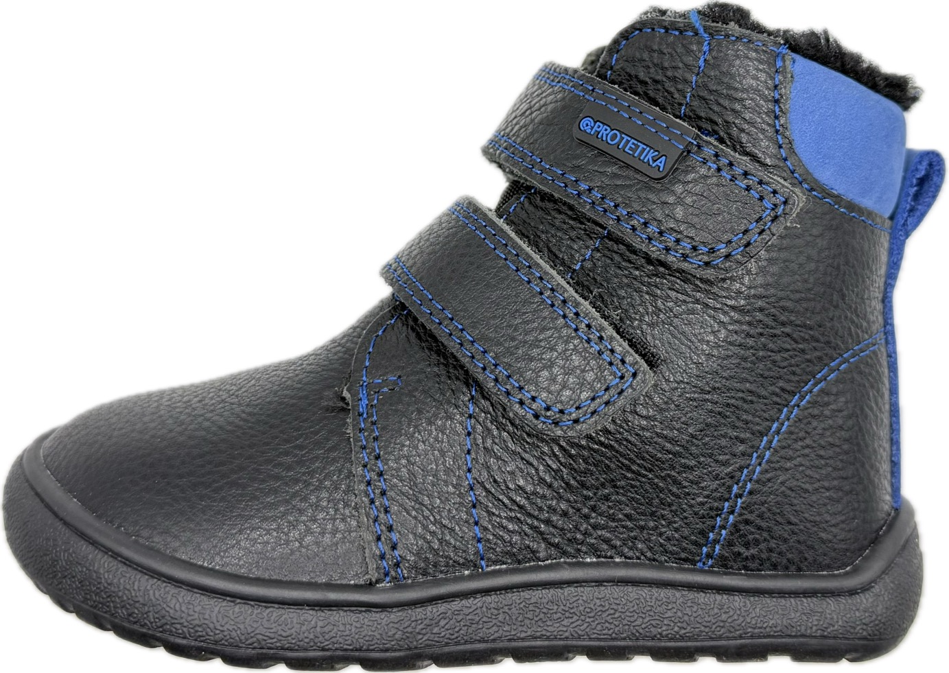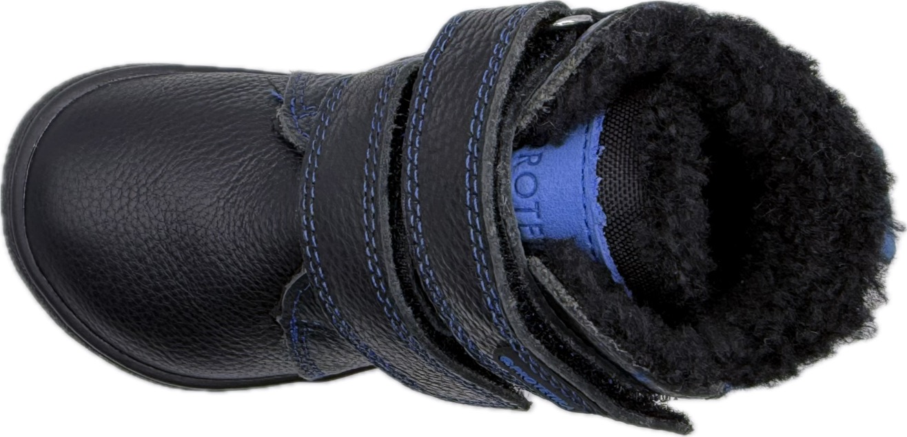 Vyšší kožené zimní botky, výrobcem označeny jako barefoot model. Svršek z hladké kůže, uvnitř umělý kožíšek. Vyjímatelná fleecová stélka bez podpory klenby. Flexibilní podešev podporující přirozenou valivost chodidla. Zpevněný opatek.