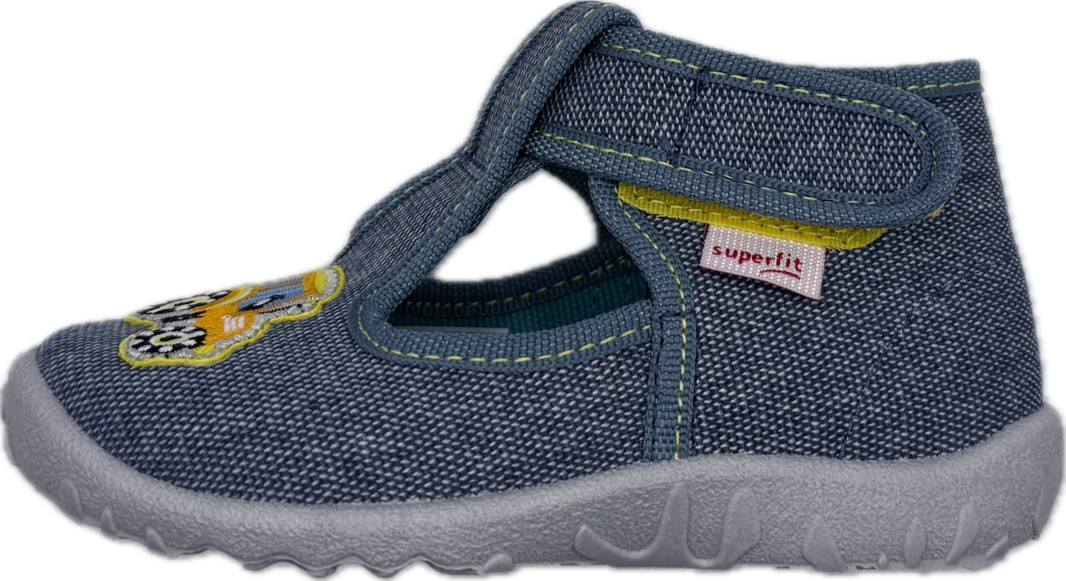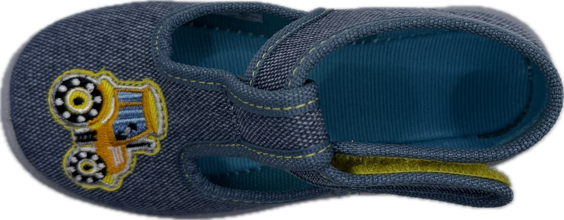 Plátěná kotníková polootevřená botička na suchý zip, kterou lze použít jako domácí obuv, příp. plátěnku do suchého počasí. Má ohebnou, perforovanou podešev, která zajistí pohodlnou chůzi a lepší prodyšnost. Svršek i vnitřek boty je textilní. Nemá vyjímatelnou stélku.